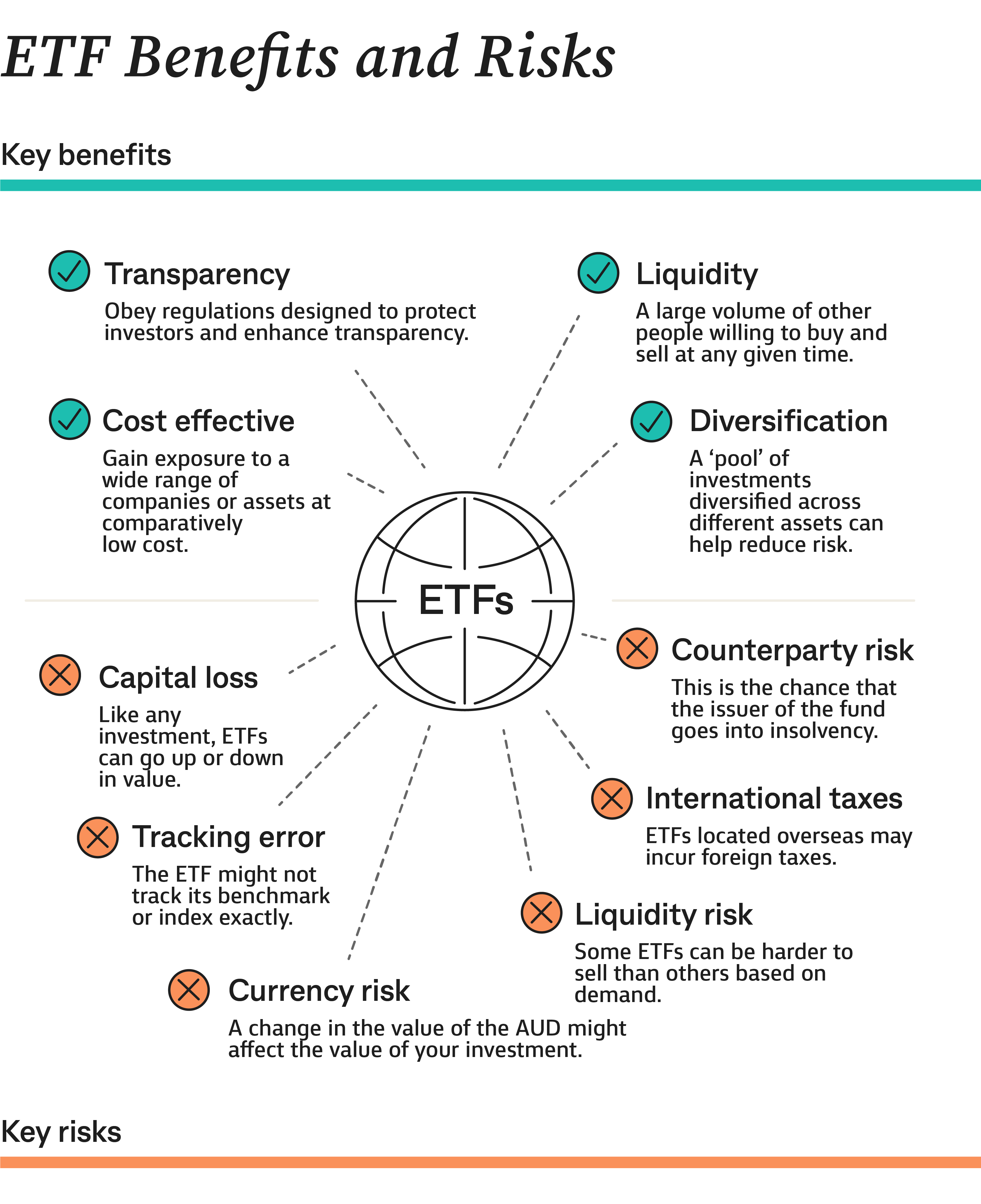 Currency risk: If you buy an ETF that invests in overseas companies or assets, a change in the value of the Australian Dollar might affect the value of your investment. Currency-hedged ETFs can lower this risk for a higher fee.